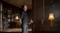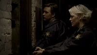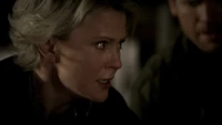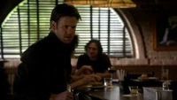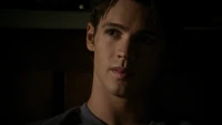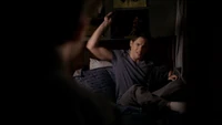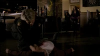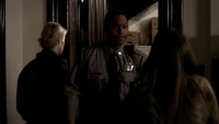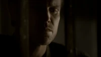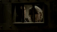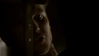 Damon asks if Stefan sent him on suicide watch, adding that Stefan is just trying to right the wrongs of the past. He adds that Alaric should hate him as he is the reason Jenna is dead, but Alaric says he doesn't blame Damon. Damon adds that he also turned Isobel into a vampire. He heads over to the door and begins strangling Alaric through the bars, begging him to kill him. Alaric croaks: "Screw you" and stabs Damon with a syringe, causing him to collapse on the floor, asking for Elena. Elena arrives at the house, but as she tries to go, in Liz appears and covers her mouth, telling her not to make a sound. Back in the cellar, Damon asks for blood, but when Alaric goes to get it, Liz appears and asks for Damon. Alaric tells her it's not a good time, but one of Liz's colleagues finds him and calls for her.