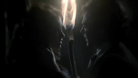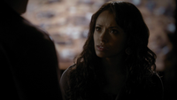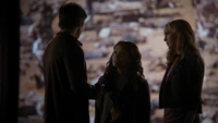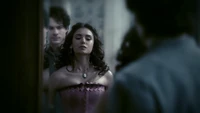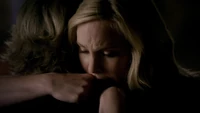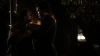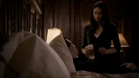 Damon croaks that if she had met him in 1864 she would have liked him, but Elena says she likes him now just the way he is. Damon closes his eyes and she kisses him. "Thank you," he says. However, Katherine appears and says he should be thanking her as she brought the cure. She says she decided to deliver it because she owed Damon. Elena asks after Stefan, but Katherine asks if she really cares. Eventually, she reveals that Stefan is paying for the cure. She explains that he gave himself over to Klaus and sacrificed everything - including Elena - to save Damon. However, she tells Elena that at least she will have Damon to keep her company. "It's okay to love them both," she adds. "I did." She throws the cure at Damon and walks away.