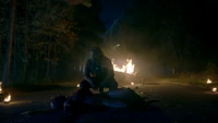 With their plan subverted, Ben and Alaric take the field to confront Ken. Alaric fires an arrow from his crossbow but he stops an arrow at his face and elects to kill them first. Ben states that he'll make him regret all the things he's done today and for all the people that've died because of it. Ken's only regret is not killing him sooner. He launches the arrow back at Ben, but Alaric jumps in front of the arrow, taking it in the shoulder. The two amuse him; a mortal and a former half-god. Ken calls out to Hope, questioning if this is the best she's got to offer him. Lizzie vamps behind him; she's his next opponent. Facing her, he quips that last time she tried to take his power, she could barely contain it. Vamping to face him directly, she tells him she's been practicing and grabs his hand, siphoning. She calls out to Ben to get her father out of there and to get him help. Ben grabs up Alaric and the two stumble out of the meadow.