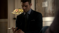 Elijah and Camille talk. He reveals what the red door is, a memory but also a metaphor. It's where his unspeakable deeds dwell in darkness. It's a red door, because it's the place where the first woman Elijah ever loved said she loved him in return, but also the place where he laid her body after he took her life. No one, not even Klaus, knows that Elijah killed Tatia, whom he loved just as deeply. Klaus still believes Esther killed her. Elijah collapses from Finn's spell.