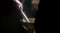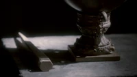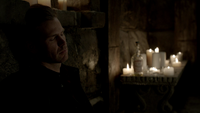 In the cemetery, Esther is preparing her spell. Elena tells Alaric this isn't who he is. Alaric responds that she only knew the weak parts of him and that Jenna's blood in on his hands. Esther is now ready to begin but Elena refuses to give her blood. Esther telekinetically forces her to do so and puts her blood in a chalice. Alaric drinks the blood and is then stabbed by Esther with the White Oak Stake.