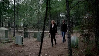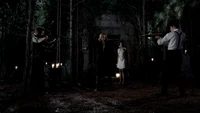 In the cemetery, Elena pulls the stake out of Alaric. Esther tells her that when he revives that he may be his old self so she should say her goodbyes. Elena tells Esther that she's doing is just as evil as what she's trying to stop. Esther tells her that Alaric will never become what her children are and he'll die when the right time comes. She tells Elena she desire a world where people like Jenna don't have to suffer from vampires. Elena is angry she would use Jenna as an excuse but Esther tells her that Jenna has found peace. A noise is heard outside and Esther goes to investigate. It is Jeremy and Matt with their weapons drawn and they want Elena to be let go. Esther is annoyed and turns their weapons onto each other. Alaric appears behind Esther and stabs her with the stake, killing her. Alaric has awoken as his old self and doesn't know what has happened to him.