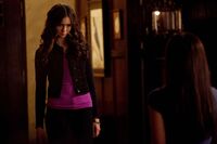 Bonnie mistakes Katherine for Elena, but sees through her deception when she touches her and senses she's a vampire. Bonnie is clearly affected by the similarities between them. After Katherine rejects Damon, he turns up drunk at Elena's, only to be rejected by her as well.
