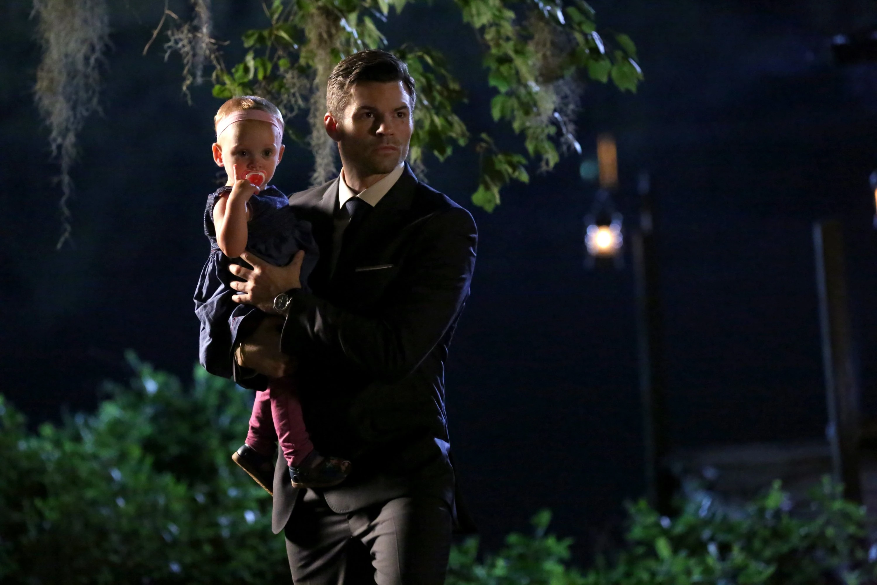 In The Devil is Damned, Cami is playing with baby Hope on the floor, while Elijah is doing the dishes and making eggs. There is a crashing noise followed by Hope crying, and Elijah looks up worried, and vampire speeds over to Hope who is crying. He stands beside her and Cami looking extremely worried, and Cami tells him that Hope yanked the tablecloth and that the knick-knack on the table fell on her, creating a cut on her forehead. Elijah reaches forwards, and his hand hovers in front of the cut and he looks scared and sad to see her crying, and he has a flashback of the "Red Door". Cami snaps him out of it, and he apologizes and finds a band-aid to put on Hope's cut. He then places her on a chair and puts the band-aid on her cut, and picks her up while Cami talks about the improvement he's making on his flashes and dealing of/with the Red Door. While Cami is talking, Elijah places Hope in her crib while she tells him that she wants to try a different approach to treating him, and gives him a list of things to do around the house. While she spends the day with Hope, Elijah spends it not thinking.