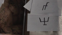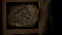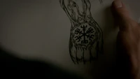 - Unique Pentagram: It is a slightly slanted pentagram that is within a ring with roots, runes and stones tangled around the outer edge. The same image was on a framed parchment in Shane's office. The symbol likely refers to the Hunter's connection to magic, as they were spelled by a witch for their powers, and likely represents the part of the story where a witch used magic to create the Five Hunters. It is located on the shoulder of the right arm on a Hunter.