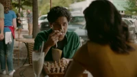 Meanwhile, MG is cooking on the barbecue for the competition with Kaleb's family, when he is introduced to Kym, who gives him tips and advice on how to cook the meat and knowing when to turn it.