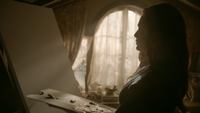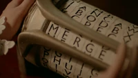 Josie reads through the numerous books on the Merge, however is unable to find anything as the corresponding pages have been removed. Lizzie approaches, and Josie uses magic to close all of the books, hiding her research. Lizzie gives her the cake, however Josie tells her that she isn't hungry. Lizzie notices the cipher, and Josie scrambles it before leaving forcefully.