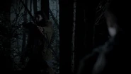 Damon walks alone in the woods and gets hit by an arrow. Someone jumps out and attacks him. Damon gets the upper-hand as they fight, then he sees the man's mark and realizes he's one of the Five. The hunter regains the upper-hand and snaps Damon's neck.