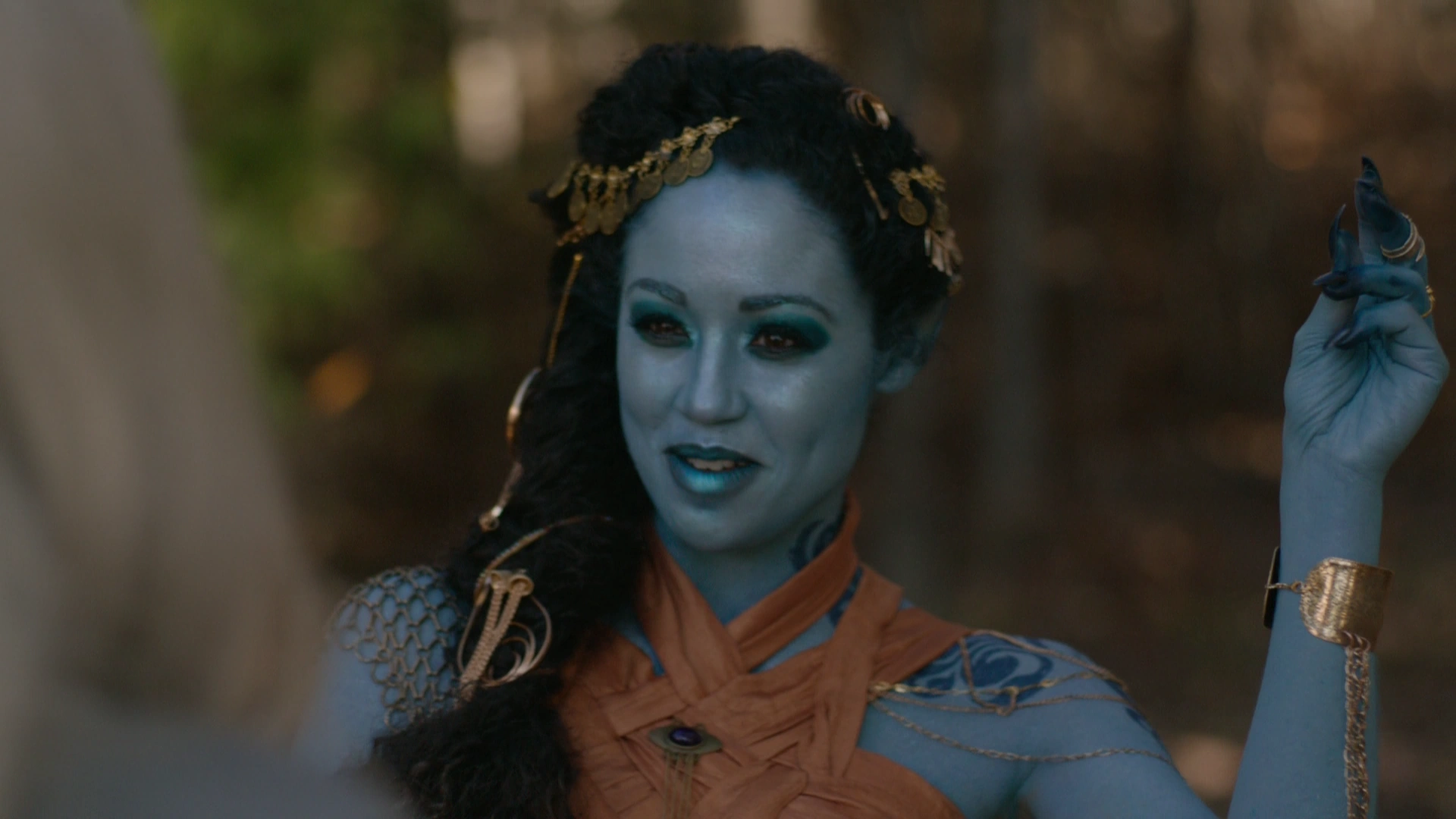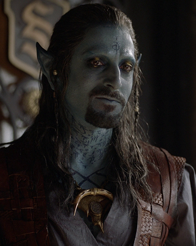 Jinni are human-like in appearance, although with a few exceptions, such as being blue-skinned with pointed ears. Darker hues of blues accentuate their fingertips, eyes, and mouths. Both Ablah and Zied also have ornate jewelry and tattoo-like drawings or languages covering certain parts of their bodies. Jinni also appears to have gold-colored blood, such as when Alaric busted Zied's lip after punching him.