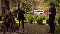Elijah, Klaus and Rebekah were burning the white oak tree, when Rebekah caught the scent of blood from two men passing by. She followed the men, until she attacked one and fed off his neck.