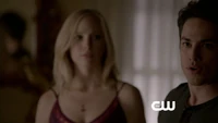 When Nadia gets off the phone, Matt tells her she's an idiot if she thinks Katherine will choose her. He knows what it's like to have a mom who only cares when it was convenient. Nadia brushes him off, adding that he's just trying to save Elena. She bites his wrist and announces the vervain is gone. He kisses her since he's going to forget it anyway. He thanks her. "If I'm going to be threatened and held against my will I can think of worse scenarios," he says. She wants more and kisses him. He rolls on top of her and takes out a phone. He sends a text. He gets as far as "Help. K-" when she sees. She's upset and feels betrayed by him. He tells her she's not like her mom, she compels him to forget everything. She gets up to leave but runs into Caroline at the front door. Matt sent a text to her from Nadia's phone, but now has no memory of it. Caroline sees he was compelled again and attacks Nadia. Nadia gets the better of her. Nadia tells Matt that he may not remember, but this is all his fault. She's about to attack Caroline when Tyler races through the door. He announces that young hybrid beats old vampire and wrestles with her, but she gets free and runs off. Matt looks for an explanation.