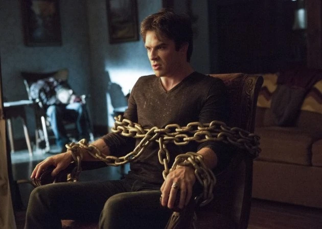 Back at Tyler's house, Caroline reports to Tyler that the only thing Matt remembers is he slept with Nadia (the cover story she gave him). She turns to go, but Tyler stops her to apologize. She tells him she wants things to be good, but he reminds her she slept with the guy who killed his mom, so they're not going to be good. Damon wakes up chained in his own cellar. He tells Stefan he's stupid for bringing him home and eventually he'll kill him. But Stefan reminds Damon he's his brother and won't give up on him. Damon thinks Elena has. She knew what being an Augustine vampire meant for Damon. She had to kill Jesse when he was one because it was the only way. And Damon saw her kick Stefan a stake. "Are you saying Elena wanted me to kill you?" Stefan asks. "You got another excuse?" Stefan thinks about it and leaves.
