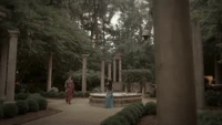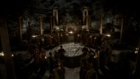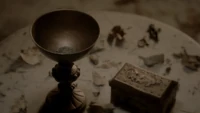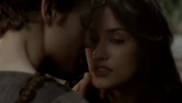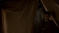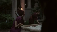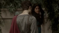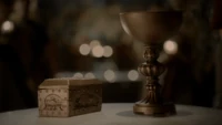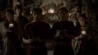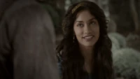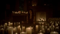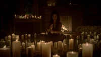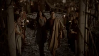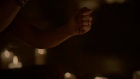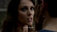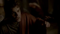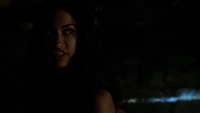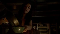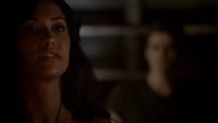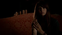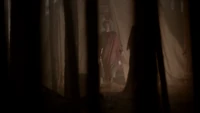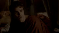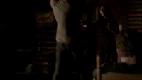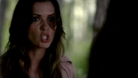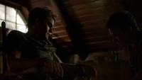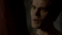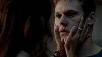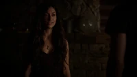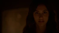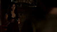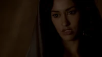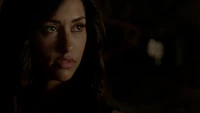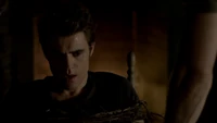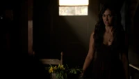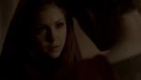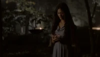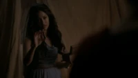 Back at the hut, Stefan is snooping in Qetsiyah's bag when she comes back in. He asks if she has a phone but she says there is no phone signal where they are. Qetsiyah then reveals more of the story of her past mentioning how at the planned wedding of hers and Silas that everything started dying and that she found out that the immortality spell that she created in the drink that would make her and Silas immortal was gone and that he was taking it somewhere else. She reveals that she found Silas' tent where she found that the woman that he was with was Amara, the original doppelgänger of Elena, and her handmaiden. Qetsiyah then tells Stefan that she is making him a daylight ring so that he can get out.