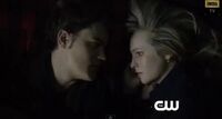 Elsewhere in Atlanta, Caroline is at a diner with Tom Avery and she explains to him that the witch – Hazel – kidnapped him. Caroline sees that Tom's a good guy and can't kill him, she tells him that he's one of the nicest people she's ever met after further questioning him and compels him to leave town on a train and find himself a place he likes, meet a pretty girl, settle down and be happy for the rest of his long, long life. Back in Mystic Falls, Damon warns a now tied up and gagged Liv to not mutter any "hocus pocus" or he'll kill her himself. He unties her, but she still doesn't talk, so he starts to torture her and Elena tells him to stop, to which Damon says that she can't tell what to do now that they're broken and Elena angrily says that that is exactly the reason why they broke up and Liv – feeling awkward – says they should just kill her already, Damon tells her that he won't, not until she talks. Liv answers that after tonight, there might only be one male doppelgänger. And if that happens, the Travelers will come for Elena to use her. The witches can't let that happen. This leads to another argument between the ex-couple and are only stopped by an intervening Jeremy. Outside the school, Luke arrives, but before he can enter, he is blocked by Matt and Tyler, but before he can use magic to get them out of his way, Tyler stops him and tells him that Liv already showed them that trick.