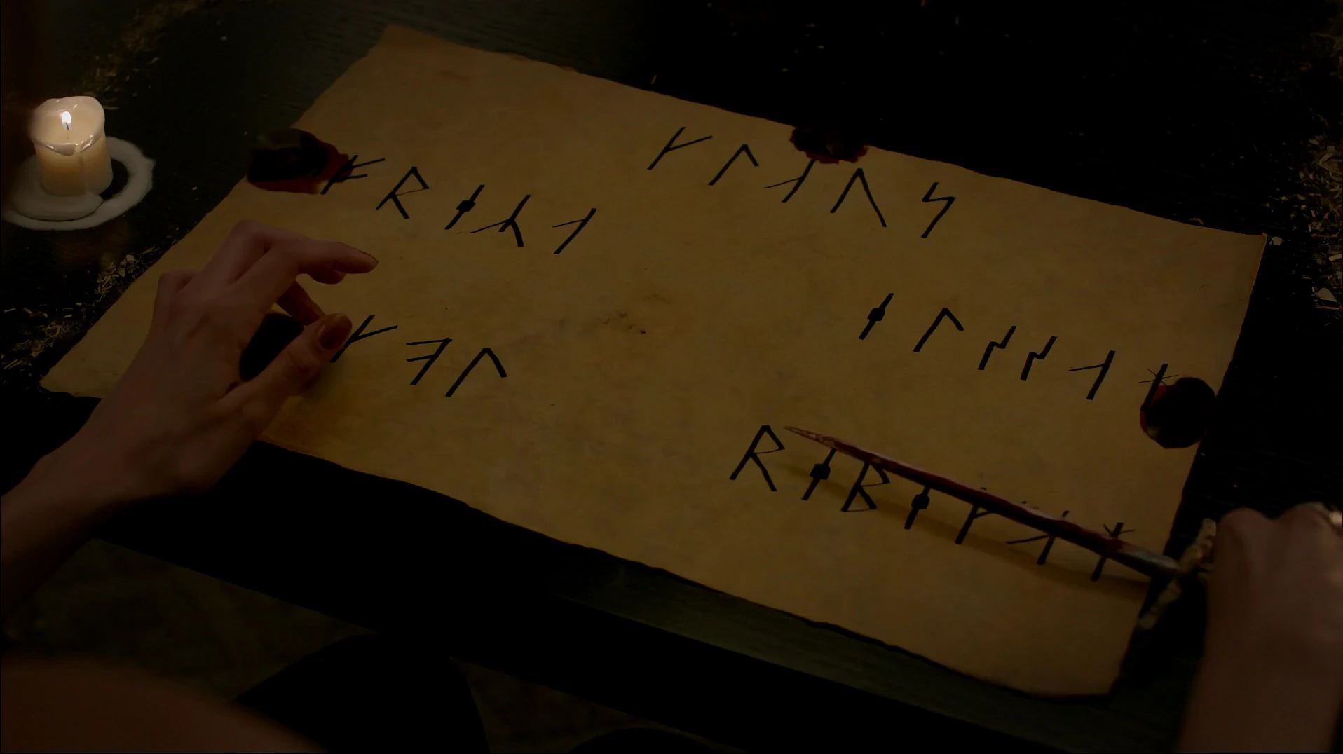 In You Hung the Moon, Elijah and Klaus asking their sister Freya to discover the true nature of the prophecy made by the witch Alexis about the destruction of Mikaelson family. The Norse witch, then, sets up the candles on a table and fills a bowl with Klaus' blood and has pieces of paper on the table with runic lines written above. While she's chanting the spell and is shaken by terrible visions, the paper with runes catch fire.