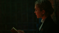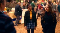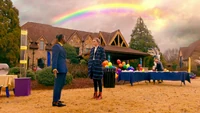Though Lizzie has rallied the students and various events, the day is a disaster. No one has shown up. Given the two-hour short notice, Kaleb can't get a marketing campaign together, so Lizzie decides the best option is to use magic. In her grimoire, she has some old Salem-era spells for dispersing angry mobs. To bring people to the school for Fundraiser Day, she intends to try and figure out if she could reverse one of them and draw people to them. Kaleb reminds her that Alaric doesn't want magic being used, and despite disagreeing with his methods, intends to follow them. However, a rainbow appears overhead, and Lizzie isn't the one who's created it.