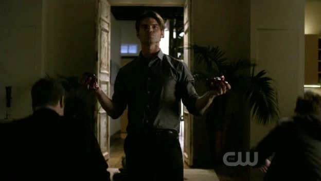 | Jenna and Alaric help save Stefan by giving him blood bags after Damon staked him in the stomach during a fight over Elena. Katherine at least temporarily saved herself by pretending not to be on vervain when Klaus ordered her to take off her lapis lazuli bracelet and stand in the window exposed to the sun, burning herself. If she hadn't it is possible that Klaus would've tortured her for what she knows and/or killed her. Matt saves Damon from being killed by Maddox by shooting him with a rifle. After knocking Matt out Damon saved Caroline and at Caroline's insistence Tyler from the Tomb. Damon saves Caroline from Tyler as he transformed into a werewolf when he uncontrollably lunged at her. However in doing so Damon got bit. Caroline and Matt save themselves from a fully transformed Tyler by running into the dungeon of the ancestral Lockwood home and locking themselves in.