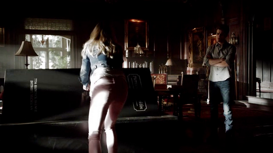 At the house, Stefan keeps watch over Katherine, trying to ensure she doesn't kill herself. She's pouty and angry about his hovering and thinks he can't help her until he deals with his own PTSD. She called in help. Caroline arrives as his sober coach—with a giant safe. Stefan questions whether the safe is a good idea for coping with his PTSD. Caroline reads up on PTSD while Stefan is in the safe. She's oblivious as Stefan starts to freak out inside. Outside, Katherine wonders how you help the guy who is always the hero for everyone else. She gets an idea.