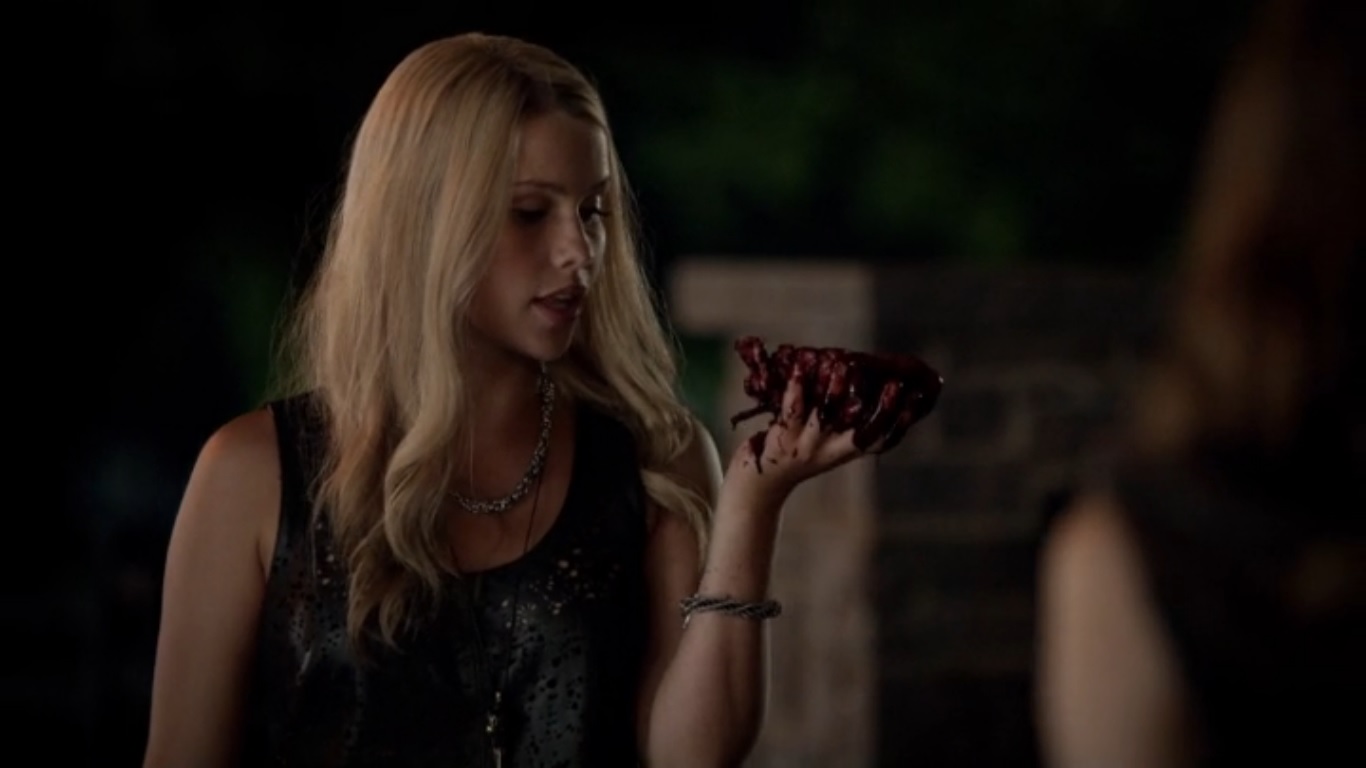 | On her way into New Orleans, Rebekah went into a bar to ask for directions and was set upon by six Vampires who didn't know that she was an extremely powerful Original Vampire, she murdered all six, very bloodily. In a flashback Klaus is seen grooming two girls at a party where he lures them upstairs and drains them of their blood. Rebekah had become stricken by the Governor's son Emil with whom she was infatuated with, she begged Klaus and Elijah to let her turn him but they refused her request, when Klaus made a joke about Rebekah's history with men, to which Emil stood up for her and confronted Klaus. Klaus responded by grabbing Emil by the throat, running him down the hallway and throwing him off of the mezzanine. Back to the present Hayley's presence in The French Quarter had consequences as she was soon found out by Marcel who ordered three of his men to hunt her down and bring back her head on a stick. They found Hayley sat on a park bench drinking hot tea, she threw the hot tea into the face of one of the Vampires. Rebekah showed up and snapped one of their necks off and ripped the heart from the other, she had saved Hayley's life, she appeared to had have killed them all but one remained alive who they took back to the Mikaelson Mansion with them. In another flashback it is shown that Marcel was a slave and being whipped by the man whom Klaus killed, he took the boy in for his own. Back to the present, Earlier in the day Josh and Tina had been partying at The Abattoir and had been fed upon and then healed and compelled by Vampires, as a consequence of Rebekah killing six of his nightwalkers, he had need for more Vampires so Klaus broke both their necks, they later wake up in transition and Marcel says only one of them will get to be immortal so he puts down a coin and says the first one to grab it gets to be a Vampire and the other one dies, Tina lunges for it no hesitation, to which Marcel snaps her neck stating that he doesn't like people who betray their friends, off-screen Josh completes his transition, in a final flashback it shows that Klaus neutralizes Rebekah with the dagger for catching her and Marcel kissing. | ||||