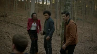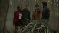 Back at the Salvatore School, Cleo identifies the creature as a pukwudgie, a woodland sprite from Native American lore. They can be quite peaceful and playful, when not beholden to a curse. Given the creature's abilities, MG believes they have finally found out what Ethan's monster side is. With their monster problem solved, this means that both he and Kaleb can return to the school. MG admits that he was quick to judgment today, unlike her and Jed. He wants to be more like the leader she is, but Cleo admits that at every turn, she asks herself, what would the MG do? Lizzie appears behind MG and Cleo encourages him to hug her. He passes right through her, as she's not back at the school but astral projecting. They have a lot to catch up on.