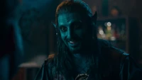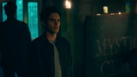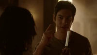 Meanwhile, Cleo believes she's discovered an answer for Ben. Coming back to the library, she discovers he's gone. Ben explains that he's walked right through her barrier because he's a god. With a sample of his blood, she places it on a tuning fork, though it hums at a frequency that even Jed can't hear. Monsters can, though, and that's how they track him. If she can spell a solution to mute this frequency, then maybe she can free Ben from his curse. Jed also shows her that the quill he was attacked with is wooden, and MG is out looking for the monster.