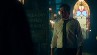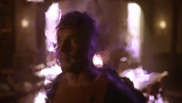 Alaric and Landon continue to try and figure out the sphinx's riddle, though Alaric becomes frustrated and decides to give up. Landon attempts to rally him, as this is his plan. The Necromancer believes that Alaric is a gullible moron who's doomed them to remain in Limbo forever. Alaric, more or less, agrees with him and believes this is the fate he deserves. Landon empathizes with him, bouncing around from one foster home to the next. He believed that if no one ever wanted him to stay, then there was something wrong with him. That is until Rafael changed that for him. With the three of them here, their sins don't define them unless they let them. He promises them that they're just one good moment away from believing it. Attempting to join hands, the Necromancer is struck with inspiration. The hands and face of a clock. The riddle is referring to the clock tower in the Town Square.