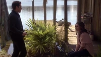Tyler: "You mean that you're pregnant? A hybrid baby, yeah, I know all about it. I've been roaming around the Bayou, asking questions. Let me tell you what I learned. This crescent birthmark means you come from a big-shot family. Some kind of royalty for the werewolves of this region. And right here, this is all that's left of them."