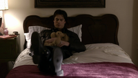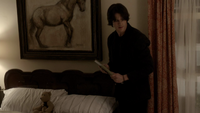 Damon proclaims her room as "just like I remember". Elena tells him to stop messing around, so he plops onto her bed and puts her teddy bear on his lap before looking at her expectantly. Damon asks her if she knows that Uncle John is in the Founder's Council, which shocks Elena to hear. She snarks that they can add that to the growing list of problems that the three of them have. Damon notices the broken lamp and asks her what happened. When she starts to look more uncomfortable, he looks at her until she finally breaks and tells him that she's worried about Stefan. She explains that he told her that everything was fine, but she can tell that he's struggling. She asks Damon how long it will take for him to get back to normal, and Damon shrugs, "A few days. Give or take." When Elena reminds him that it's already been a few days, Damon snits "Give then, I don't know. What's the big deal?" He gets up and hands her the teddy bear, and Elena states that Stefan isn't himself. Damon walks over to her dresser and opens the top drawer. Damon suggests that maybe Stefan's problem is that he's spent too long denying his nature as he pulls a bra out of the drawer and admires it. Elena swipes it from him and puts it back, telling him to not make her regret calling him. Damon sighs and tells her that it is what it is; the Stefan she knows is the "good-behavior Stefan", due to him fighting against his nature, and informs her that if she doesn't think there is another part to this situation, she hasn't been paying enough attention. Elena reminds him that he's not Damon, but Damon retorts that Stefan doesn't want to be Damon, but that doesn't mean that he isn't, deep-down. He steps closer towards her, looks at her, and leaves.