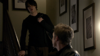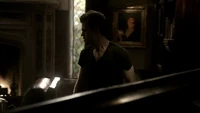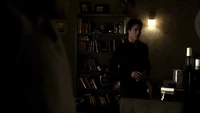 At the Salvatore Boarding House, Stefan is pacing around the library, looking for a book. He appears to be very anxious and wound-up, and pours himself a glass of scotch that he gulps down quickly.