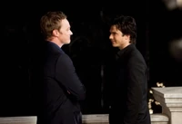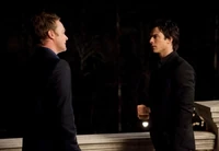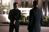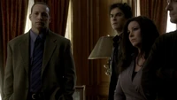 Damon and Alaric leave the party behind John Gilbert. John says he hates being the last to leave a party because it's desperate, and asks Damon if he's going to try to kill him again, or if he's going to have Alaric do it. Alaric asks how he knows him, and John just says, "I do. Alaric Saltzman, a high school history teacher with a secret. When Damon points out that he knows a lot for someone who just got to town, John simply replies that his knowledge of Mystic Falls goes far beyond what anyone else knows. He then warns them that if they've planned a "high-speed snatch-ring-vamp-kill move", they should know that he has a fail-safe that will send everything he knows about vampires to the Council, including the tale of the original Salvatore brothers. Damon is shocked and speechless. Alaric asks how he got the ring, and John answers that he inherited one, and his brother Grayson had the other. The ring John is wearing was Grayson's, and the one Alaric is wearing was his that he gave to Isobel, although had he know she'd given it away, he would have kept it.