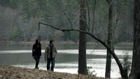 Back at the Gilbert House, Elena pops into Jeremy's room and asks him if he has time to talk. When Jeremy says yes, she tells him they should get out of the house, and walk to a lake. Once there, Elena informs him that she is adopted. Jeremy is shocked that their parents never told her, but Elena is sure that they would have eventually, had they not died. Jeremy asks her why she was too worried to tell him, and Elena confesses that she felt weird about it, going her whole life thinking she's her parents biological child, and Jeremy's biological brother. When Jeremy asks her if it bugs her that she isn't, Elena assures him that he is her brother and always will be, no matter what. Jeremy smiles, and Elena uses that opportunity to bring up his vampire paper for Alaric's class. Jeremy mentions that Alaric has been really cool about helping him raise his grades and get extra credit. Elena asks him why he chose vampires, and he blames boredom, or the possibility that he is just as mental unstable as his ancestors were. When Elena tells him that the Gilberts aren't crazy, Jeremy cracks a joke, "Easy for you to say, you're not one." Elena feigns offense and elbows him.