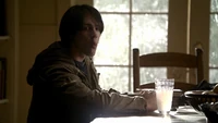 Stefan does pull-ups in his bedroom. Damon comes in with a glass of blood and makes a snarky comment about his loud music. Damon asks Stefan when he's going back to school, and Stefan, who is now on the floor doing push-ups, tells him he will soon. Damon, exasperated, tells him that his "self-detox" is not natural and pushes him to go back to human blood. Stefan asks him to get his glass of blood away from him and continues his work-out. Damon asks him how long it took him to wean off of it the last time he drank human blood, and Stefan just ignores him. "That's not good," Damon snarks. "I'll be fine; it just takes a little bit of time", Stefan retorts. Damon reminds him that he doesn't have to kill to survive, and tells him that he hasn't hunted a human in way too long. "That's what blood banks are for." Stefan snarks that he's impressed, and Damon tells him that he's being self-serving, and that he's working hard to get the town off of the vampire's trail, which has become difficult since the tomb vampires are running around. When Stefan asks him what he's planning on doing about them, Damon says they can't do much of anything if Stefan doesn't have his strength, and reminds him again that "there's nothing wrong with partaking in a healthy diet of human blood from a blood bank. You're not actually killing anyone."