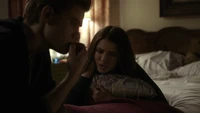 Elena rubs Stefan's shoulder and asks him how he's doing. He reassures her that he's doing much better, although he is still anxious and on edge, but that he'll be okay. Elena admits that she's been really worried about him, and missed him a lot. Stefan maintains that he just needed to lay low for a little while and let his body re-adjust, since it has only been a few days since he had to drink her blood. Elena sighs that it has felt like a lifetime, and kisses him. They start kissing more passionately, and Stefan lays Elena down on her bed. Soon, Elena rolls on top of him, but Stefan rolls back on top more aggressively. He stops kissing her for a moment before his game face emerges, and he instinctively pushed himself away so hard that he threw himself against the wall, breaking the lamp on Elena's desk. Elena looks at him with a worried expression.