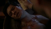 In Jed's memories, he watches the night he becomes a werewolf. His father addresses his pack who cheers for him. They have a code, and to some find it harsh, but it is their way. He gives them all the opportunity to challenge it, or his authority as alpha. No one dares to object and he remarks that their way will continue. He explains that there's no room for weakness in this pack nor is there no room to feed mouths that don't provide. He calls over Jed and Trey, explaining that one of them will become a wolf before the full moon rises. Jed questions what would happen to the other, but his father throws a baseball bat between the two of them He wants Jed to make him proud and to murder his fried Trey, activating his curse. Jed continues to suffer from the poison as Alaric watches over him and Ben. Alaric hears Cleo calling for help and leaves to investigate.