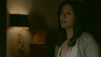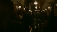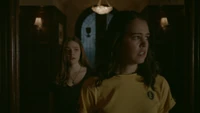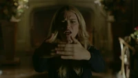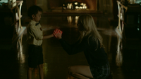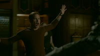 Back at the school, Alaric orders that the school is on lockdown, and everyone is to return to their rooms, with the younger students going with Emma and the older students using the buddy system. Alaric rushes to his office, unlocking his draw and pulling out the supernatural knife. When he leaves his office, he comes face to face with the gargoyle in the halls. Alaric attempts to stab the gargoyle with the knife, but the gargoyle is able to sense this and grabs his arm, sneering at him.